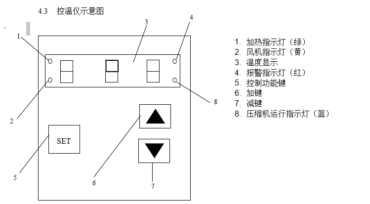 4.5.1.5 按一下“SET”鍵確認設(shè)定溫度,新溫度設(shè)定后,這時控溫儀就轉(zhuǎn)換為顯示箱內(nèi)實際溫度。